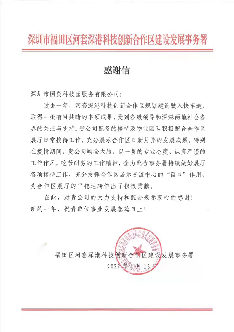 近日,國貿(mào)科技園公司收到一封來自深圳市福田區(qū)河套深港科技創(chuàng)新建設(shè)發(fā)展事務(wù)署的感謝信,高度認(rèn)可深港科創(chuàng)項(xiàng)目部物業(yè)團(tuán)隊(duì)一年以來為河套深港科技創(chuàng)新合作區(qū)展示中心提供的物業(yè)管理服務(wù)。