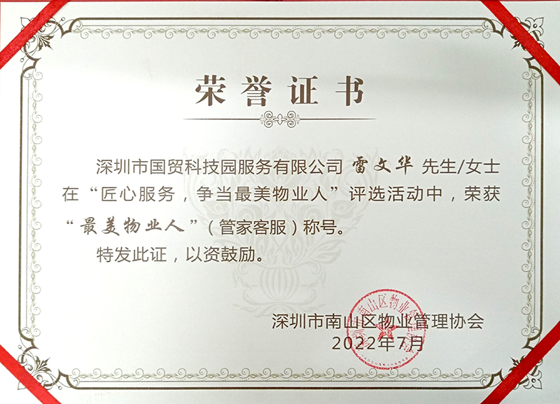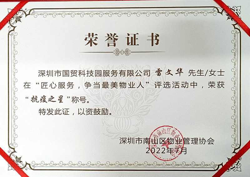 近日,深圳市南山區(qū)物業(yè)管理協(xié)會(huì)開展“匠心服務(wù),爭(zhēng)當(dāng)最美物業(yè)人”評(píng)選表彰活動(dòng),國(guó)貿(mào)科技園高新區(qū)分公司工業(yè)村管理處雷文華憑借過硬的業(yè)務(wù)能力和專業(yè)服務(wù)水平,榮獲“最美物業(yè)人”(管家客服)和“抗疫之星”稱號(hào)。