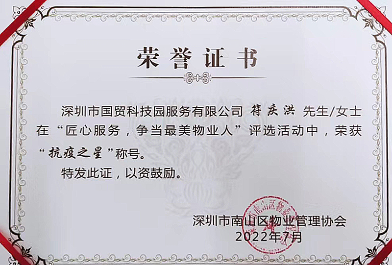 近日,深圳市南山區(qū)物業(yè)管理協(xié)會開展“匠心服務(wù),爭當(dāng)最美物業(yè)人”評選表彰活動,國貿(mào)科技園產(chǎn)業(yè)園分公司生態(tài)園項目一二區(qū)員工符慶洪憑借兢兢業(yè)業(yè)、任勞任怨的工作態(tài)度和作風(fēng),獲評“抗疫之星”榮譽(yù)稱號。