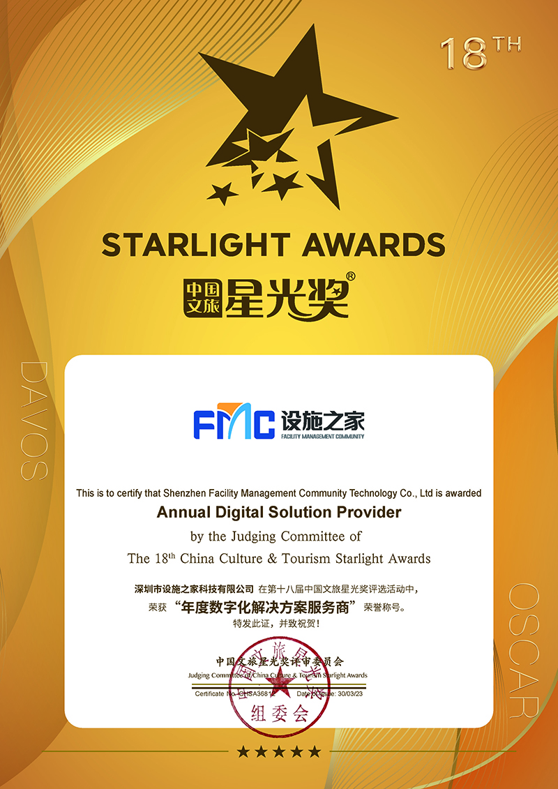 近日,2023 AHF亞洲酒店及旅游業(yè)論壇暨第十八屆中國文旅星光獎頒獎典禮盛大舉行。設(shè)施之家憑借高品質(zhì)的數(shù)字化服務(wù)能力,榮膺第十八屆中國文旅星光獎“年度數(shù)字化解決方案服務(wù)商”稱號。