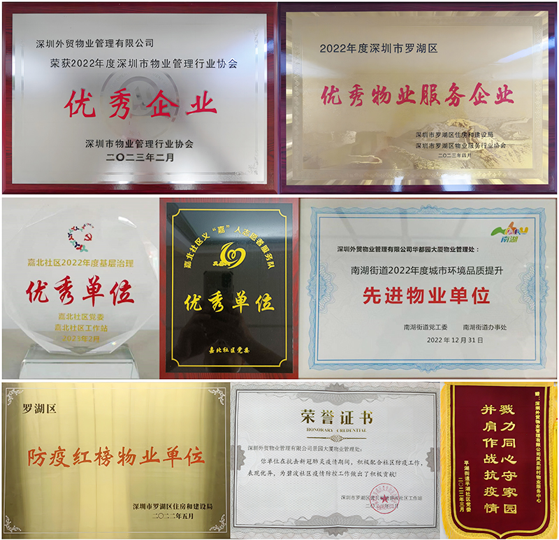 在全體員工的共同努力下,公司先后獲得“2022年度深圳市物業(yè)管理行業(yè)協(xié)會(huì)優(yōu)秀企業(yè)”“深圳市羅湖區(qū)2022年度優(yōu)秀物業(yè)服務(wù)企業(yè)”等榮譽(yù)稱號(hào);下屬管理單位天俊大廈管理處獲得南湖街道“2022年度生活垃圾分類綠色小區(qū)先進(jìn)單位”、嘉北社區(qū)“2022年度基層治理優(yōu)秀單位”及“義‘嘉’人志愿服務(wù)優(yōu)秀單位”稱號(hào);華都園大廈管理處獲得南湖街道“2022年度城市環(huán)境品質(zhì)提升先進(jìn)物業(yè)單位”稱號(hào),管理處主任李學(xué)建獲得羅湖區(qū)物業(yè)服務(wù)行業(yè)協(xié)會(huì)“羅湖經(jīng)理之星”稱號(hào)等榮譽(yù)。