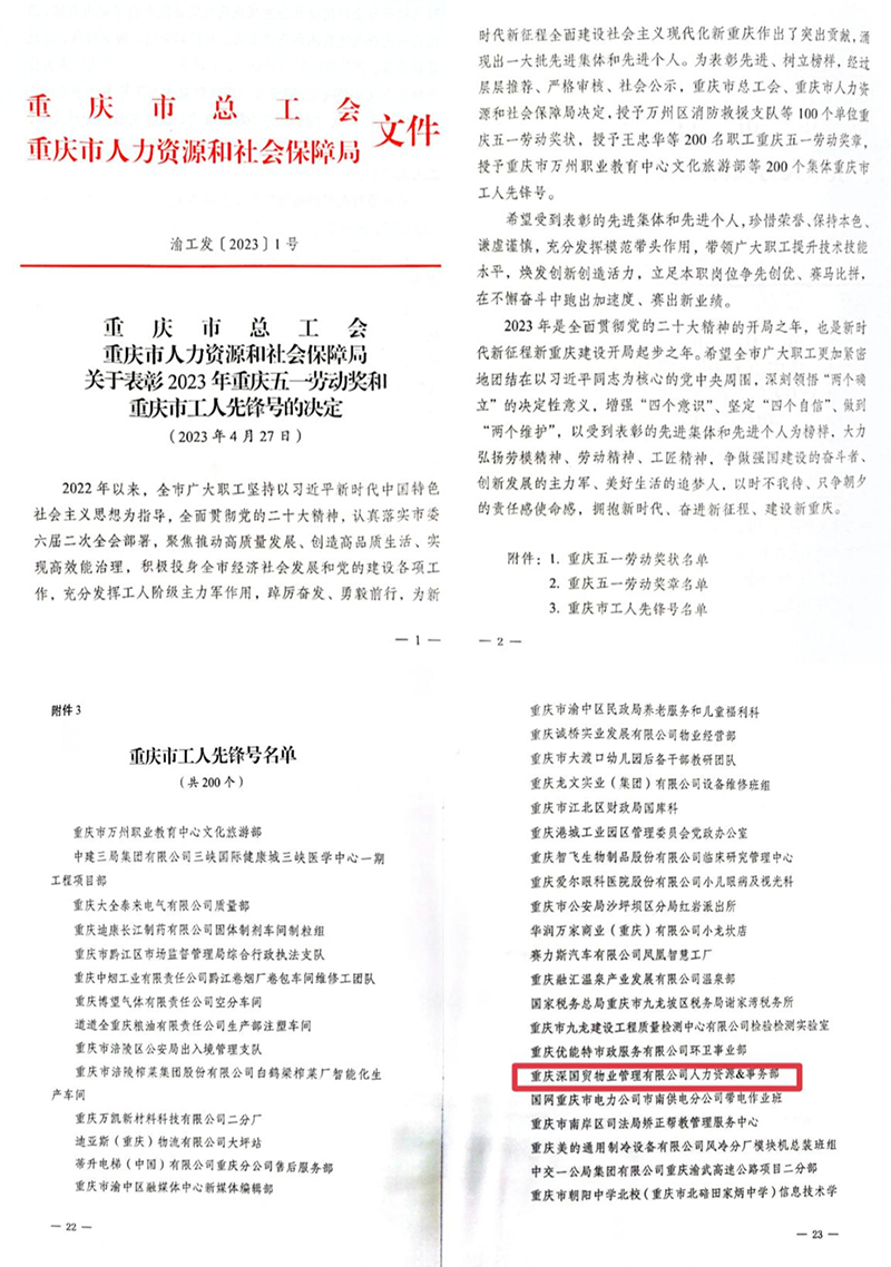 近日,由重慶市總工會、重慶市人力資源和社會保障局主辦的2023年“五一”國際勞動節(jié)暨五一勞動獎和工人先鋒號表彰大會圓滿舉辦,重慶深國貿(mào)公司人力資源事務(wù)部榮獲“重慶市工人先鋒號”稱號。