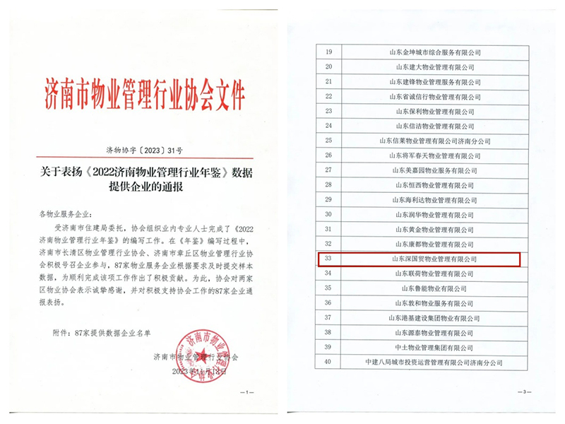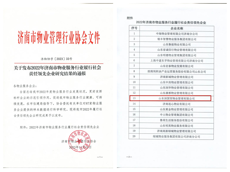 近日,《2022濟南物業(yè)管理行業(yè)年鑒》(以下簡稱《年鑒》)正式發(fā)布,山東深國貿(mào)公司榮獲“濟南市物業(yè)服務(wù)綜合實力領(lǐng)先企業(yè)”“濟南市物業(yè)服務(wù)行業(yè)履行社會責(zé)任領(lǐng)先企業(yè)”兩項榮譽稱號。