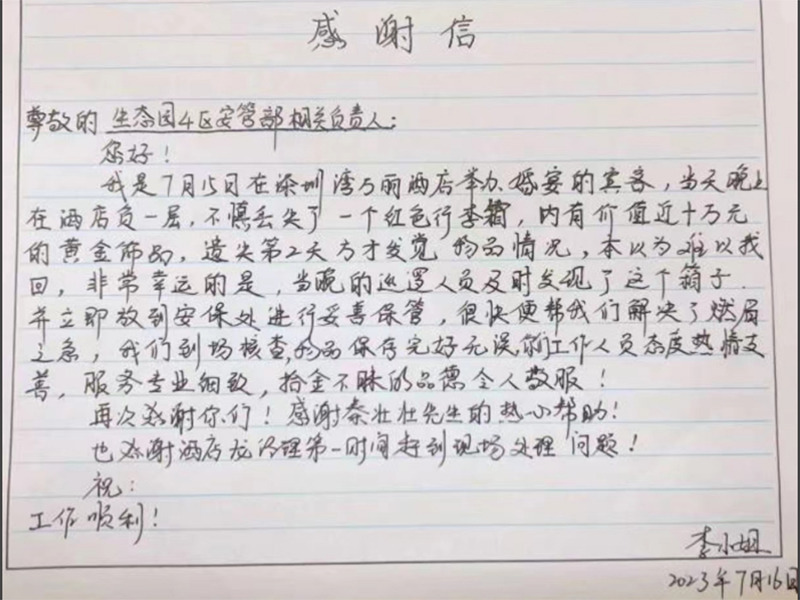 7月17日凌晨1點30分,生態(tài)園四區(qū)值班隊員在巡邏時,發(fā)現(xiàn)一個遺失的行李箱,第一時間上報情況,次日在工作群中收到找到失主的消息后,主動與失主聯(lián)系,在核對失主的身份和失物信息后,及時歸還遺失行李箱,得到失主的誠摯感謝。