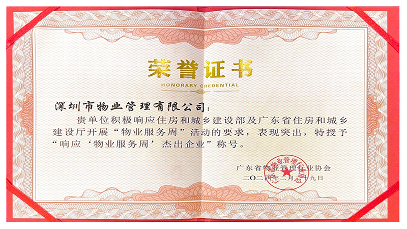 深圳市物業(yè)管理有限公司因快速響應、積極落實中華人民共和國住房和城鄉(xiāng)建設部《關于春節(jié)期間開展“物業(yè)服務周”活動的通知》和省、市兩級主管部門有關工作要求,圍繞“物業(yè)服務周”主題,積極組織開展小區(qū)居民生活日常服務工作,榮獲“積極開展‘物業(yè)服務周’活動杰出企業(yè)”稱號。