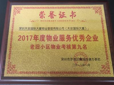 天安國際大廈物管公司榮獲羅湖區(qū)南湖街道“2017年度物業(yè)服務優(yōu)秀企業(yè)”稱號