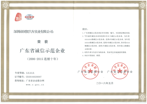 2016-05-18國貿(mào)汽車公司連續(xù)十年獲得“廣東省誠信示范企業(yè)”稱號
