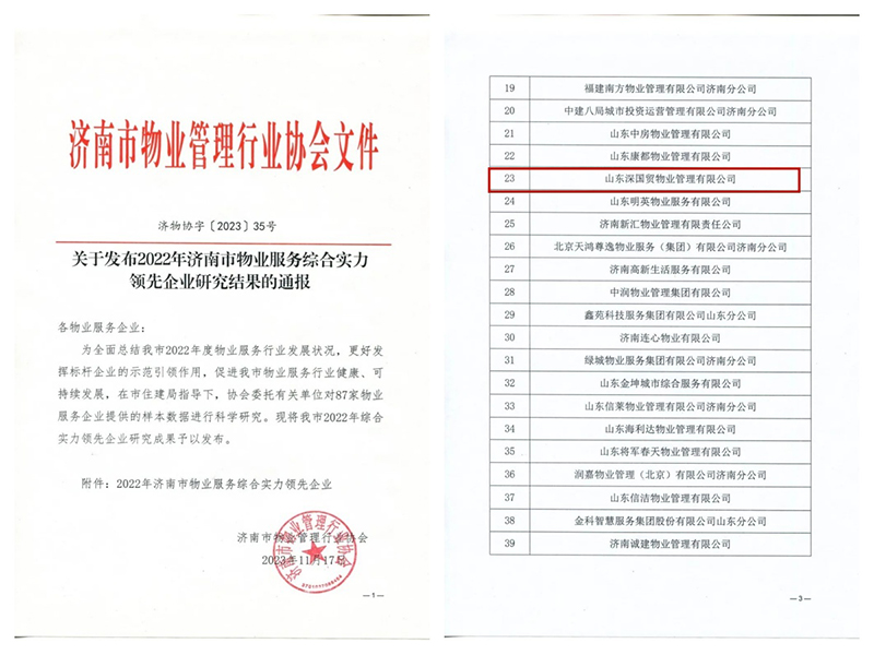 2023-11-28山東深國貿(mào)公司榮獲“濟(jì)南市物業(yè)服務(wù)綜合實(shí)力領(lǐng)先企業(yè)”等兩項(xiàng)榮譽(yù)稱號(hào)近日,《2022濟(jì)南物業(yè)管理行業(yè)年鑒》正式發(fā)布,山東深國貿(mào)公司榮獲“濟(jì)南市物業(yè)服務(wù)綜合實(shí)力領(lǐng)先企業(yè)”“濟(jì)南市物業(yè)服務(wù)行業(yè)履行社會(huì)責(zé)任領(lǐng)先企業(yè)”兩項(xiàng)榮譽(yù)稱號(hào)。 -