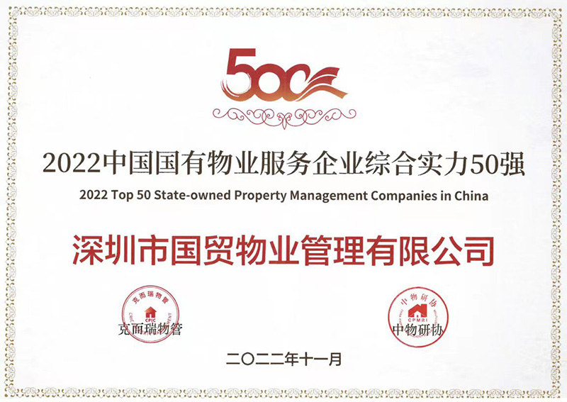 2022-11-18國貿(mào)物管公司榮獲“中國國有物業(yè)服務(wù) 企業(yè)綜合實力50強”等八項榮譽近日,克而瑞物管和中物研協(xié)發(fā)布2022中國物業(yè)服務(wù)企業(yè)綜合實力研究成果,揭曉2022中國物業(yè)服務(wù)企業(yè)綜合實力500強、2022中國國有物業(yè)服務(wù)企業(yè)綜合實力50強以及各細分業(yè)態(tài)、特色領(lǐng)先物業(yè)服務(wù)企業(yè)及標桿項目,國貿(mào)物管公司憑借領(lǐng)先的服務(wù)理念和優(yōu)質(zhì)的服務(wù)品質(zhì),榮獲八項榮譽。 -