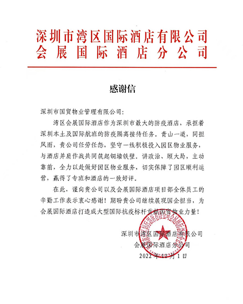 2022-11-18國貿(mào)科技園公司會展國際酒店項目團隊獲贊近日,國貿(mào)科技園公司收到一封來自灣區(qū)會展國際酒店的感謝信,對公司會展國際酒店項目服務(wù)團隊的專業(yè)物業(yè)服務(wù)保障工作給予充分認可和肯定。 -