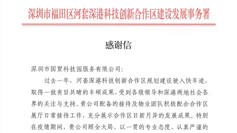 2022-02-23國貿(mào)科技園公司深港科創(chuàng)項(xiàng)目部獲福田區(qū)河套深港科技創(chuàng)新合作區(qū)建設(shè)發(fā)展事務(wù)署點(diǎn)贊近日,國貿(mào)科技園公司收到一封來自深圳市福田區(qū)河套深港科技創(chuàng)新建設(shè)發(fā)展事務(wù)署的感謝信,高度認(rèn)可深港科創(chuàng)項(xiàng)目部物業(yè)團(tuán)隊(duì)一年以來為河套深港科技創(chuàng)新合作區(qū)展示中心提供的物業(yè)管理服務(wù)。