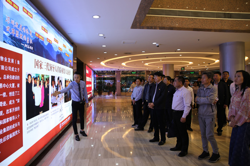 參觀過程中,深物業(yè)集團黨群辦公室工作人員詳細介紹了國貿(mào)大廈相關(guān)歷史,如建設(shè)過程中創(chuàng)造“三天一層樓”的“深圳速度”;1992年鄧小平同志在國貿(mào)大廈發(fā)表了聲震世界的“南方談話”,掀起中國改革開放的浪潮。國貿(mào)大廈從此成為“深圳速度的體現(xiàn),改革開放的象征”。