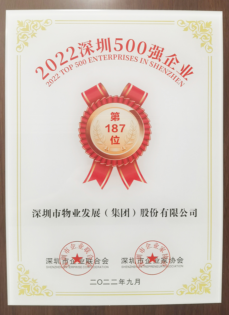 2022-12-06深物業(yè)集團(tuán)榮獲“2022深圳500強企業(yè)”稱號近日,深圳市企業(yè)聯(lián)合會、深圳市企業(yè)家協(xié)會發(fā)布了《2022深圳500強企業(yè)發(fā)展報告》及“2022深圳500強企業(yè)”榜單,深物業(yè)集團(tuán)憑借卓越的綜合實力再度榮耀上榜,位列第187位。 -